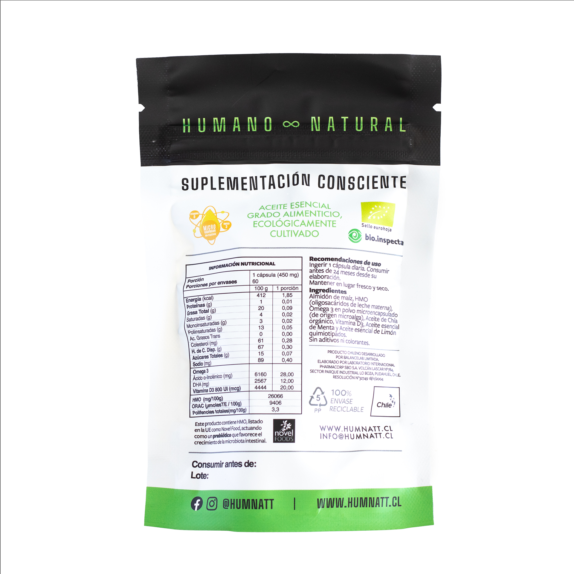 Vitamina D3, Omega 3, prebiótico HMO, aceite de Chía, aceite esencial de Menta y Limón.