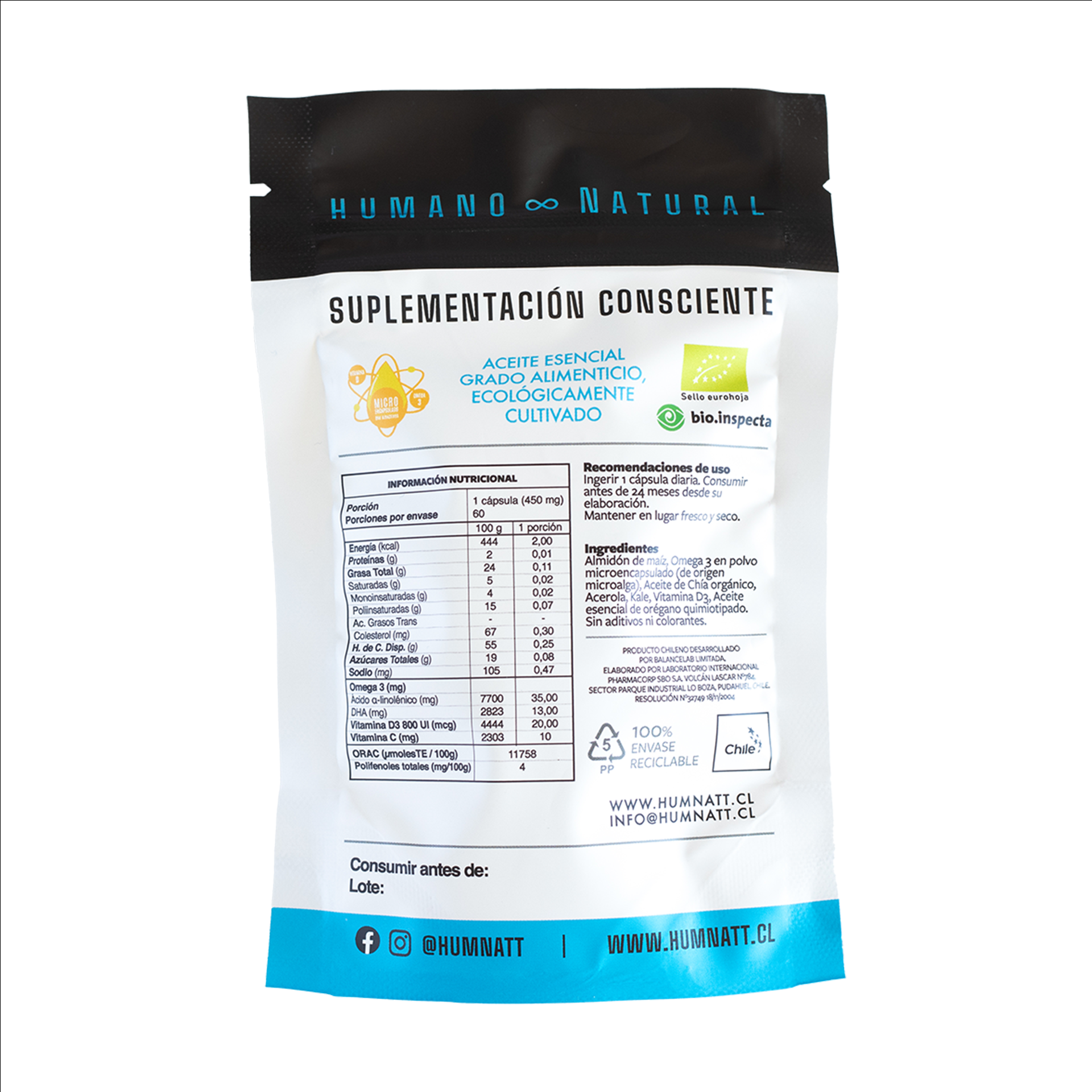 Vitamina D3, Omega 3, VitaminaC de la Acerola, minerales y vitaminas del Kale, aceite de Chía, aceite esencial de orégano.